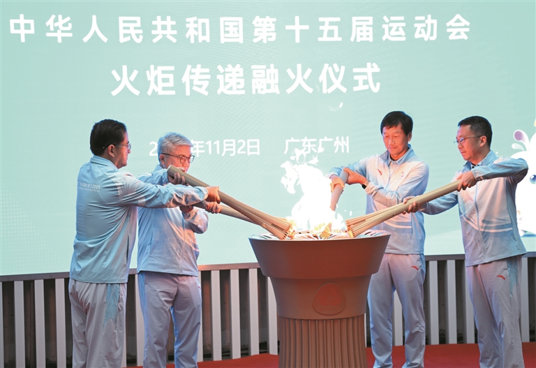 11月2日,四位城市代表在融火仪式上共同点燃火种盆。 当日,第十五届全运会火炬传递融火仪式在广州举行。 (新华社发)