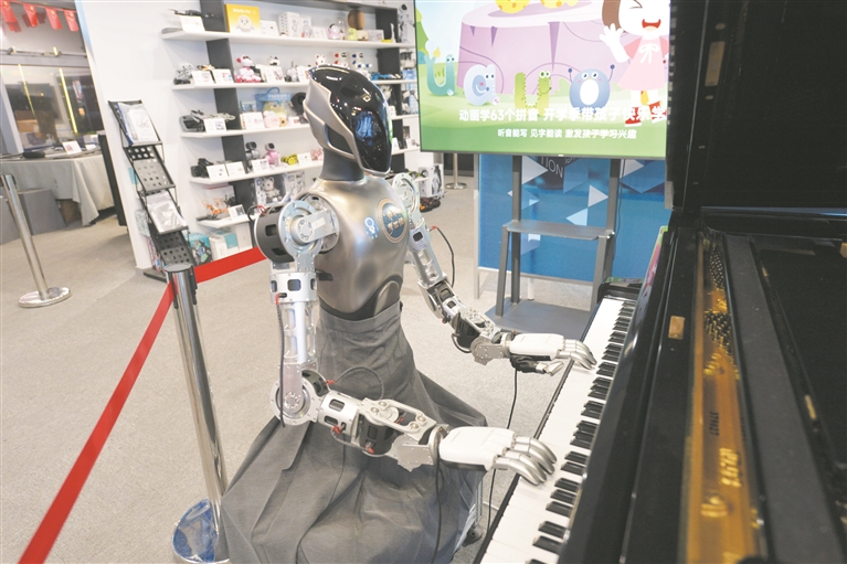 10月28日,在位于广东深圳的机器人6S店内,机器人在弹钢琴。 (新华社发)