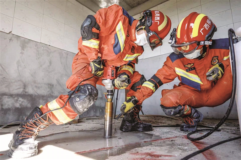 在演练中,消防员接到命令后迅速集结,并按要求完成摩托化行进、营地搭建、狭小空间破拆、门窗支撑以及垂直向下破拆等项目。其间,安排专业人员对消防员进行现场指导和讲解,让其在演练过程中巩固救援知识。