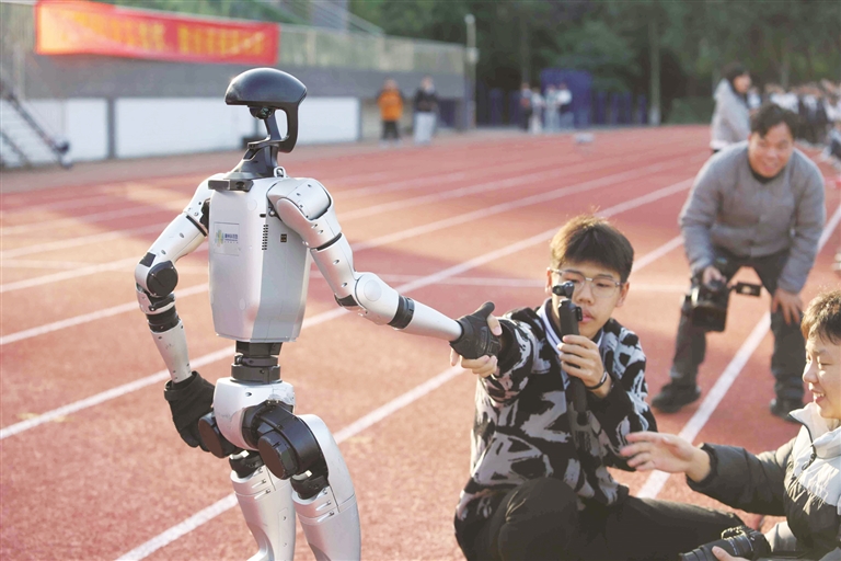 活动现场,学生与机器人互动。(图片由市二中提供)