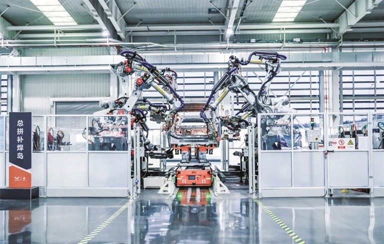 上汽通用五菱岛式工厂里,工业机器人可参与造车的各环节。