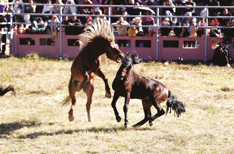 活动现场热闹非凡,场上对决的两匹公马时刻保持“战斗状态”。它们时而低头对峙、谨慎试探,时而前蹄腾空、挥蹄猛踹,一时难分胜负。一幕幕惊险刺激的角逐,引得现场观众阵阵欢呼。来自北京的游客张二强难掩兴奋:“这是我第一次来融水斗马场看斗马,太震撼了!”钦州游客陆小明也赞不绝口:“现场冲击力超强,比赛办得真好!”