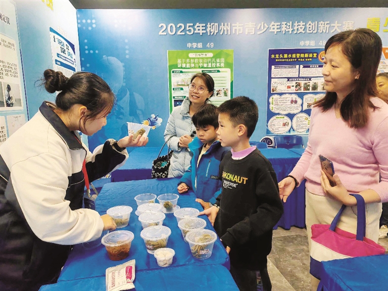 从今年参赛作品看,不少作品的设计灵感来源于生活。首次参赛的鱼峰区里雍中学初三年级学生黄丽莲介绍,鱼峰区里雍镇有不少农户种植豆角,家家户户腌制酸豆角作为家庭美食,部分酸豆角还供应给一些柳州螺蛳粉品牌。为此,她结合“家庭版腌制酸豆角制作工艺及关键影响因素研究——以里雍镇豆角搭架与水质、盐类、甜酒添加为例”项目,希望能让更多农村学生树立起保护和传承民间腌制技艺的意识,并通过实验检测酸豆角中pH值、盐度、亚硝酸盐含量等参数,为家庭版酸豆角腌制提供更多科学有效的参考方案。
