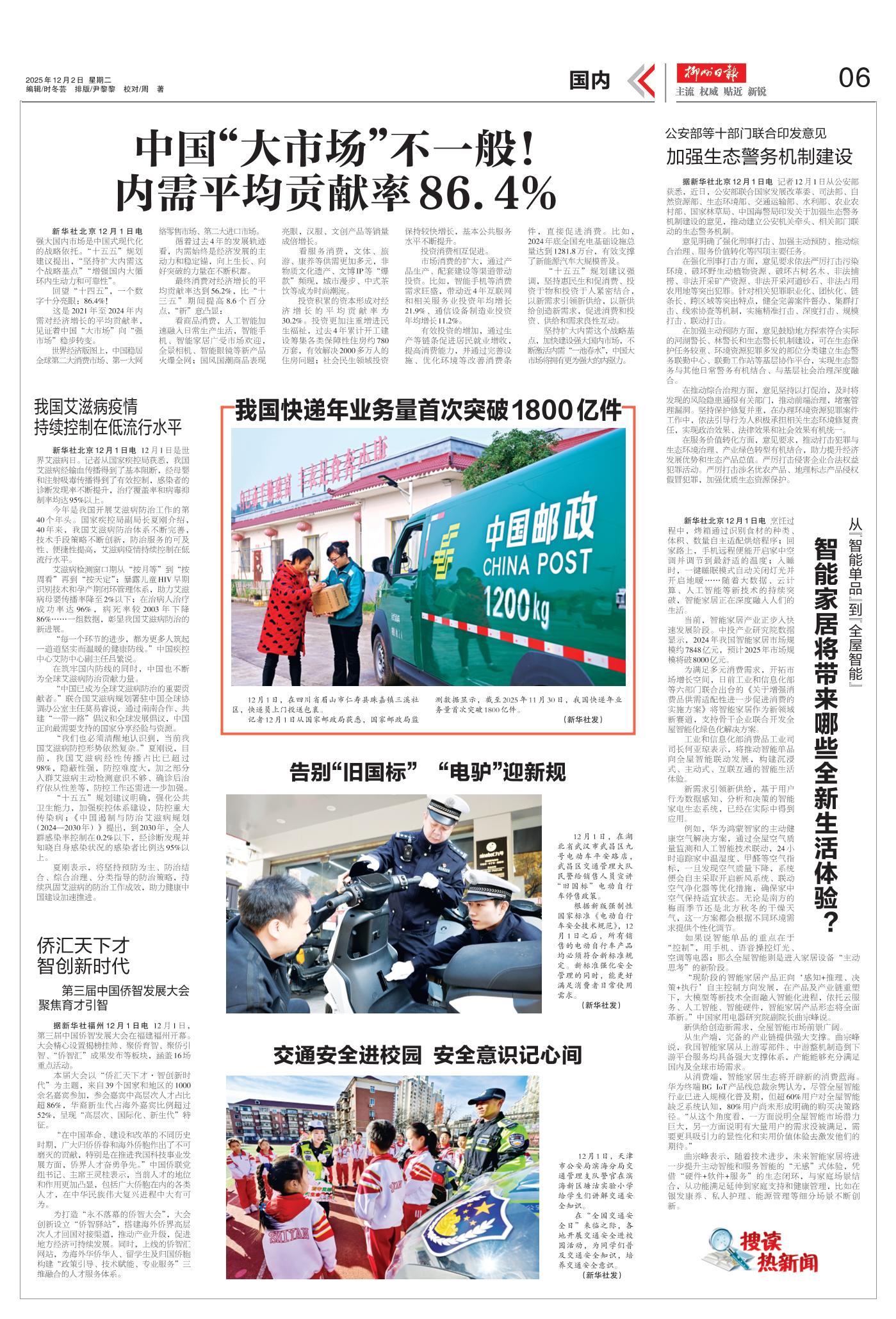 记者12月1日从国家邮政局获悉,国家邮政局监测数据显示,截至2025年11月30日,我国快递年业务量首次突破1800亿件。