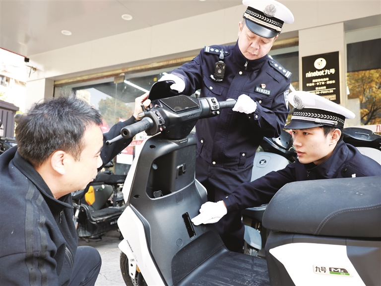 12月1日,在湖北省武汉市武昌区九号电动车平安路店,武昌区交通管理大队民警给销售人员宣讲“旧国标”电动自行车停售政策。