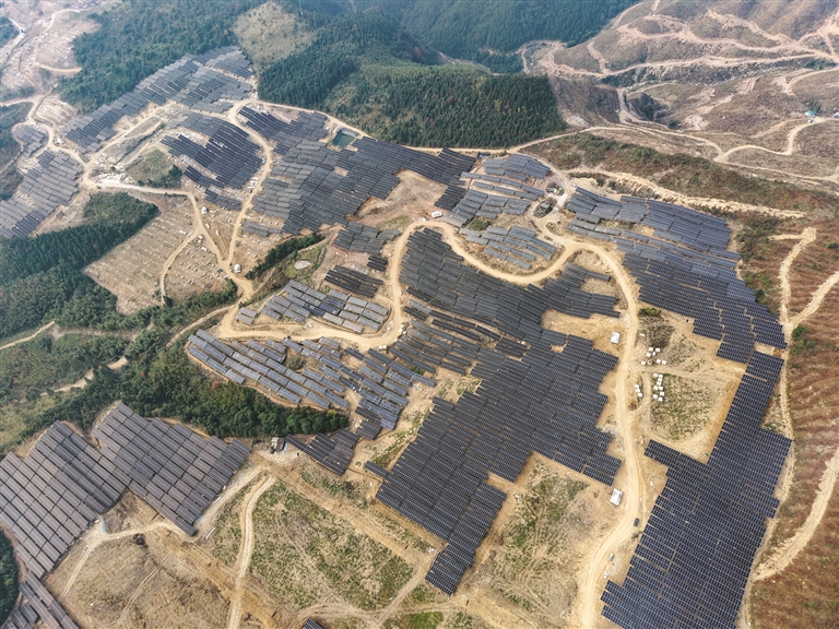 融安县泗顶镇马田村泗公洞屯,漫山遍野的光伏板正在铺开。