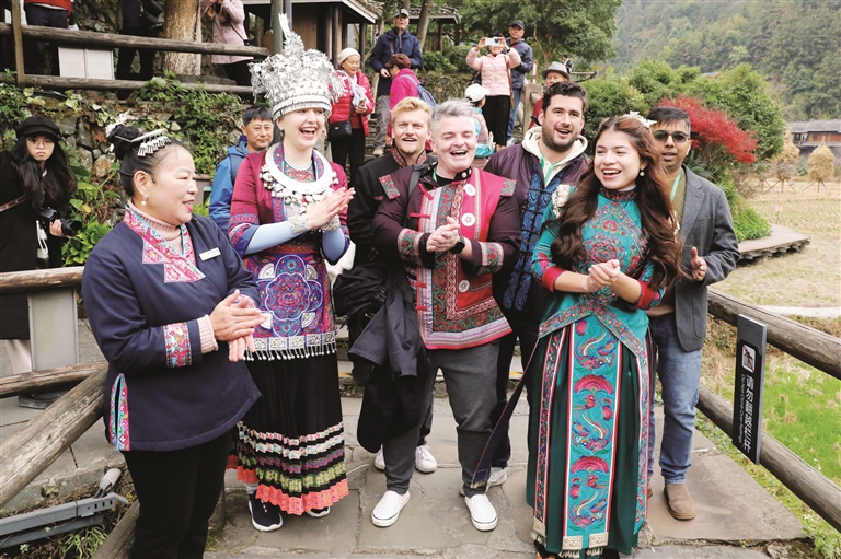 12月5日,外国友人在三江侗族自治县程阳八寨景区程阳永济桥头游览。本报通讯员 陈裙裙 摄