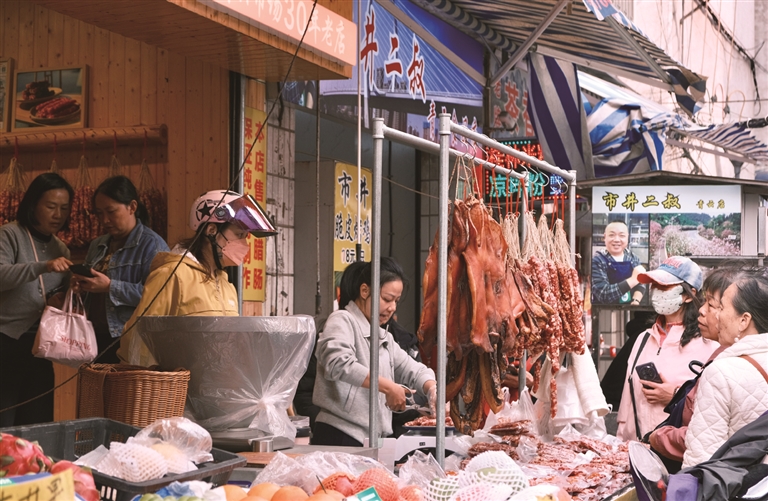 “我们从上个月下旬开始制作售卖腊肉、腊肠等,这两天顾客送来的猪肉明显增加了不少。”在一家开了30多年的腊肠店前,老板周先生一边整理刚加工好的腊肠,一边介绍。目前,他的店铺已进入腊肠加工销售旺季,可加工或购买甜口、咸口和麻辣味3种口味,除此之外还有腊肉、腊猪脸售卖。
