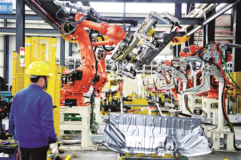 在柳北区白露工业园的汽配企业数字化车间内,工业机器人执行智能焊接任务。 全媒体记者 黄蕊 摄
