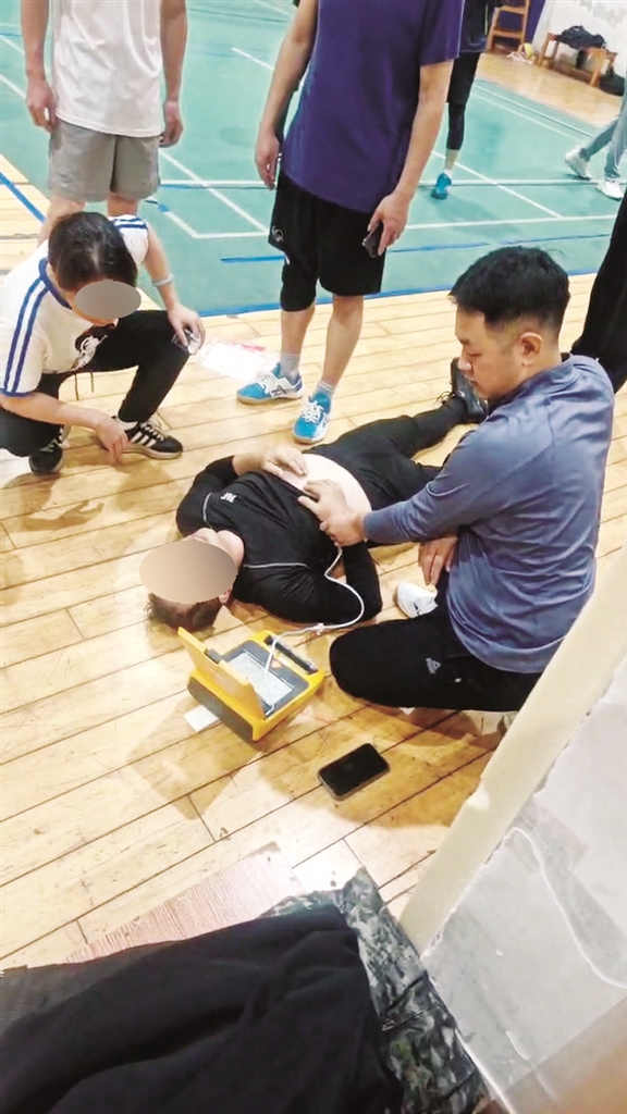 杨启志回忆,当时男子面色发绀,有热心球友正在对其进行心肺复苏,但男子的情况并未好转。杨启志上前检查后发现其呼吸、心跳均已停止,呼之不应。在场球友告诉杨启志,男子此前打过两场球,在场下休息时忽然身体无力倒地。杨启志初步判断该男子突发恶性心律失常,当务之急就是使用自动体外除颤器(AED)进行除颤。