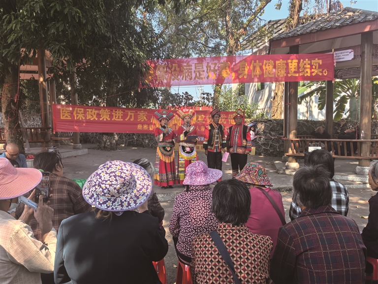 鹿寨县平山镇利用山歌的形式向群众宣传医保相关政策。