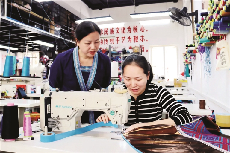 李伊园指导员工制作苗艺民族服装。