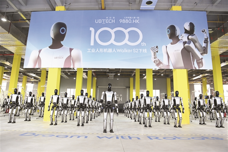 两百余台人形机器人组成恢宏方阵,宛如即将出征的铠甲战队。一台刚走下生产线的机器人穿越方阵小跑而来,挥着手说:“我是优必选柳州机器人超级智慧工厂生产的第1000台工业人形机器人Walker S2……”