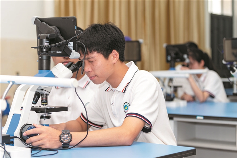 柳州市第一中学学生上生物课。 (周宁 摄)