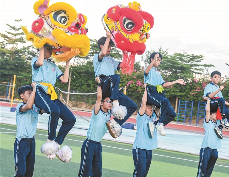 鹿寨县鹿鸣中学学生练习舞狮。(覃科 摄)