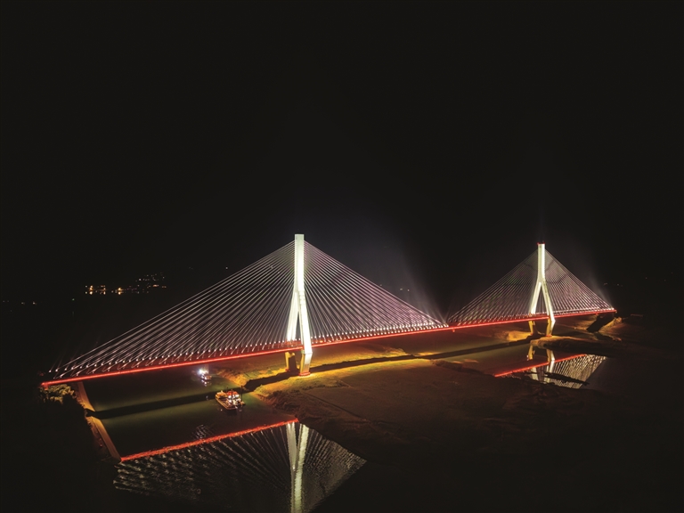 青洲柳江特大桥全长1675米,是鹿寨—钦州港公路(鹿寨至鱼峰段)(以下简称“鹿峰高速”)的控制性工程,主桥采用双塔双索面斜拉结构,是广西跨径最大的无辅助墩斜拉桥。项目方相关工作人员介绍,此次亮灯测试旨在检测设备运行情况及查验亮度效果,为次日鹿峰高速项目正式通车做足最后准备工作。