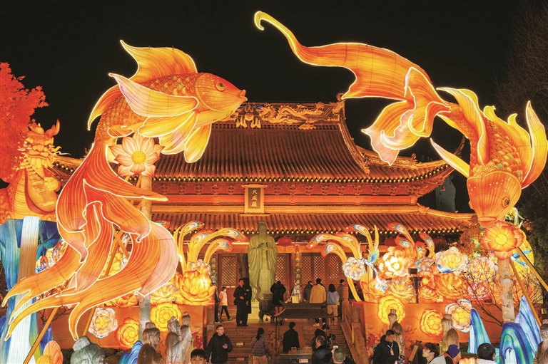 12月30日,市民游客在南京市秦淮区夫子庙大成殿景点参观各种灯彩。