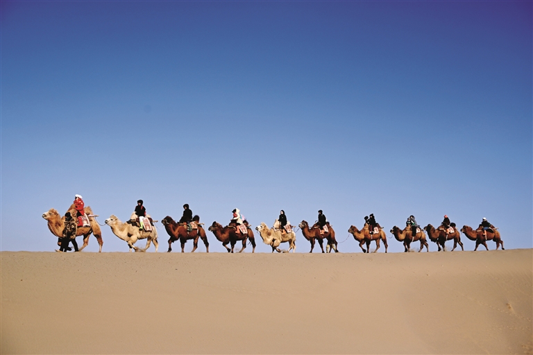 1月2日,游客在甘肃省敦煌市鸣沙山月牙泉景区游览。(新华社发)