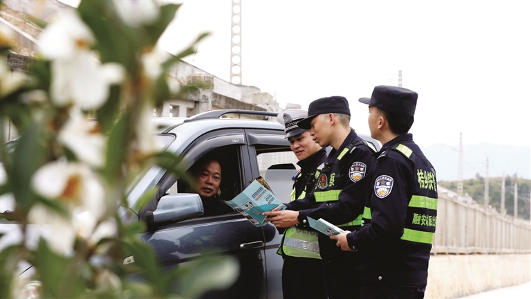 上月30日,在融安县长安镇江口村,民警向交通运输车辆车主发放宣传资料。