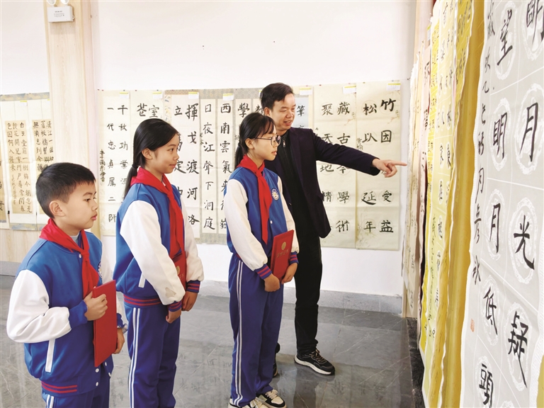 展厅里,师生们在欣赏书法作品。