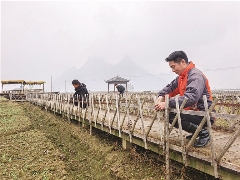 近日,细雨绵绵,寒意袭人,但柳江区百朋镇和村庄园里却暖意融融。村民们在为即将到来的春节旅游旺季做准备——搬运建材、打桩固基、覆膜理垄。大家一边忙碌,一边畅谈家常,欢声笑语不断。