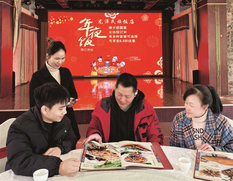 “团圆龙潭五香大碗扣”“吉祥金瓜瑞丰年”……几名市民在龙潭公园民族饭店浏览菜单,菜单中既有传统硬菜,也有极富民族风味的特色佳肴。“年夜饭要吃得有滋有味,想再看看菜单,适当调整套餐菜式。”市民王先生说,一家人在园区欣赏秀美山水,感受节日氛围与民俗文化之后在此聚餐比较方便。记者了解到,该饭店包厢已全部订完,大厅席位预订过半,年夜饭预订套餐可享8.8折优惠。柳州宾馆阳光西餐厅推出了年夜饭主题特色餐预订服务,中西餐品类齐全,菜品搭配兼顾仪式感与团圆氛围,可为消费者提供更多元的选择。