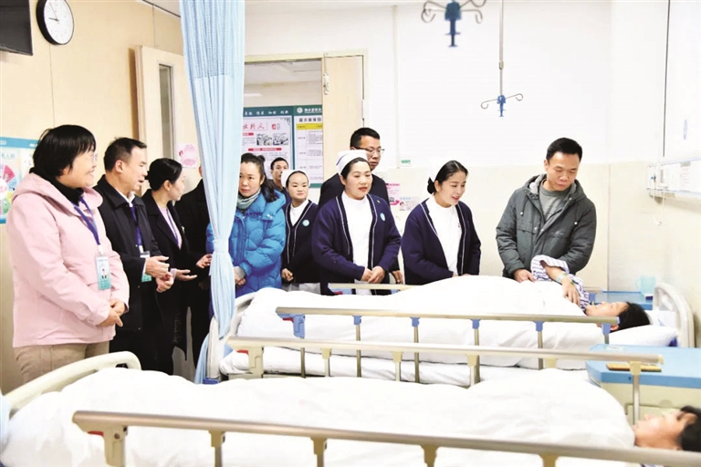 1月8日,融水苗族自治县人民医院在骨二科正式启动“无陪护”病房试点,相关人员在该病房了解“无陪护”试点工作。