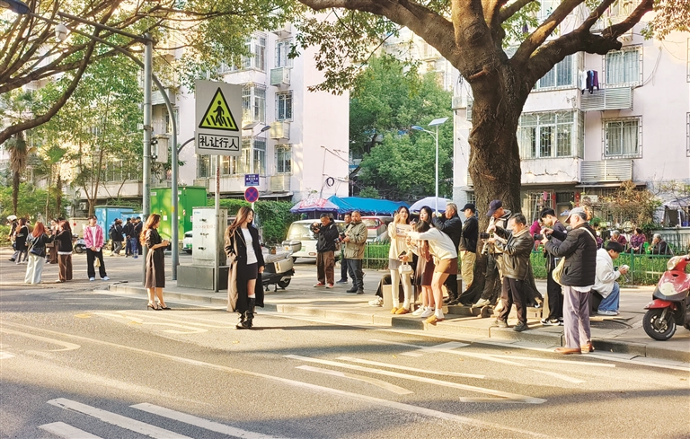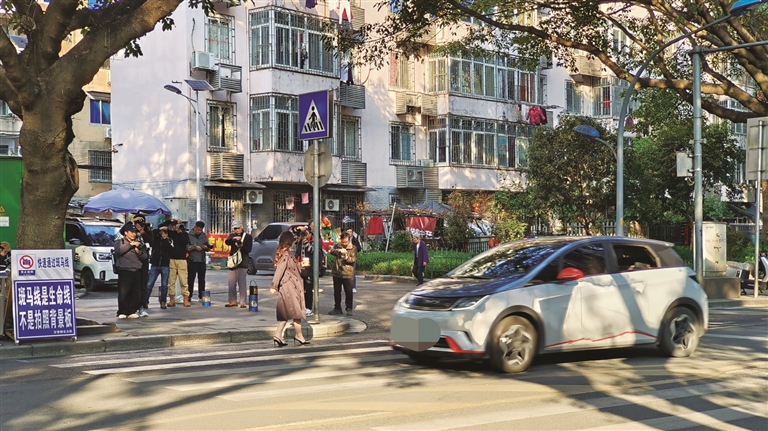 记者实测发现,这条斑马线较短,正常通过要10余秒。然而,据记者两天蹲守观察,许多人为拍出“氛围感”,反复进入机动车道或长时间在斑马线上逗留,拍摄一组照片耗时10分钟至20分钟。