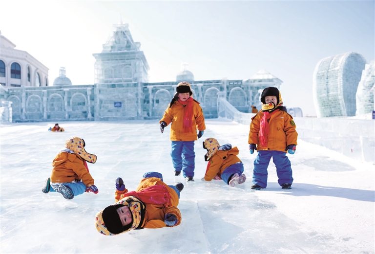 1月14日,广西“小砂糖橘”在位于吉林长春的长春冰雪新天地玩冰滑梯。(新华社发)