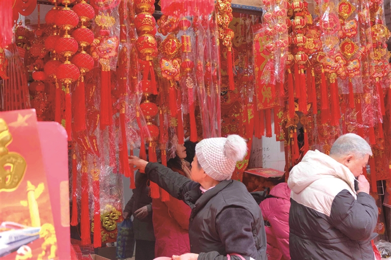 2月16日,正值除夕,我市各个市场、商超年味十足,各式各样的春联、窗花、红包等节庆饰品销售火热。在青云民生市场,众多市民在采购年夜饭食材之余,驻足挑选春联、灯笼等节庆饰品(见上图),将年味与烟火气一同带回家。鱼峰区文昌路某连锁超市里,置办年货的人群熙熙攘攘,红包、年画等备受市民青睐。