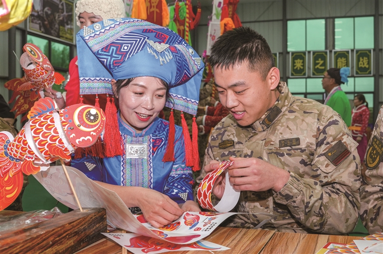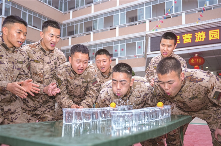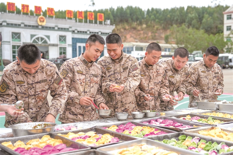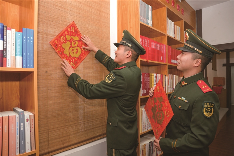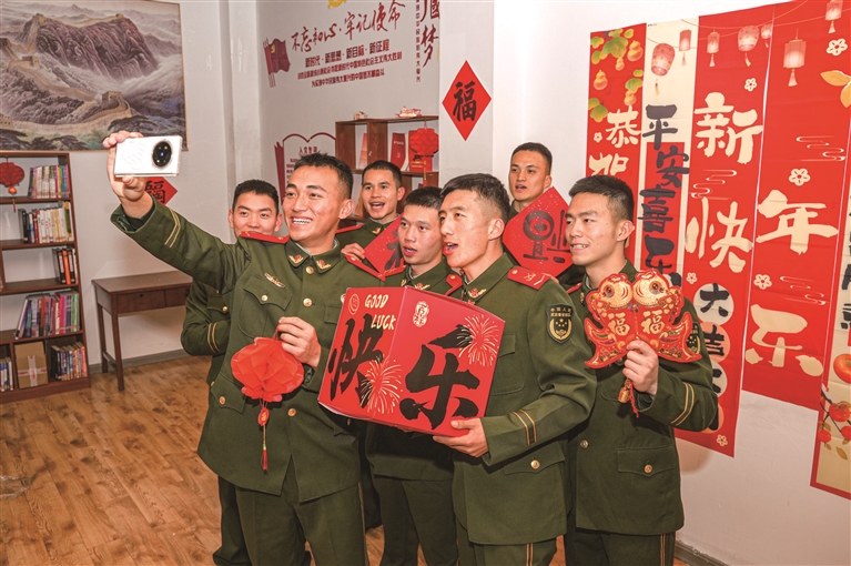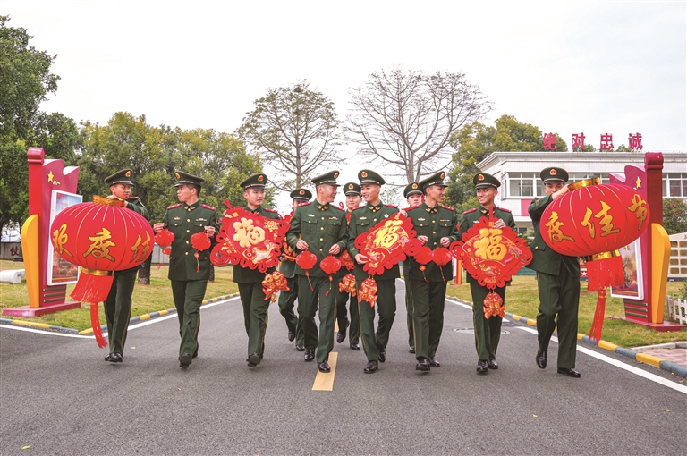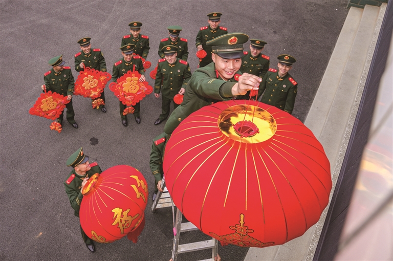 来自五湖四海的武警官兵坚守战位,就地过年,虽心怀对亲人的思念,却在军营大家庭中倍感温暖、不觉孤单。官兵们欢聚一堂,包饺子、贴“福”字、剪窗花,开展趣味游园,在欢声笑语中共度佳节。