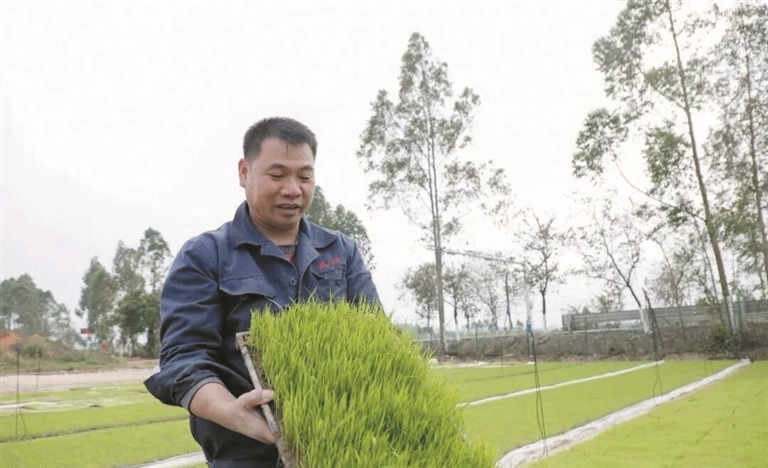 规模化育秧基地,种粮大户展示健壮的早稻秧苗。(柳城县融媒体中心供图)