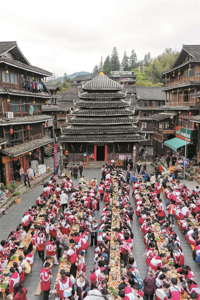 3月28日,柳州铁一中学学生在三江侗族自治县林溪镇程阳八寨景区体验侗族百家宴,开启侗寨春日研学之旅(见上图)。