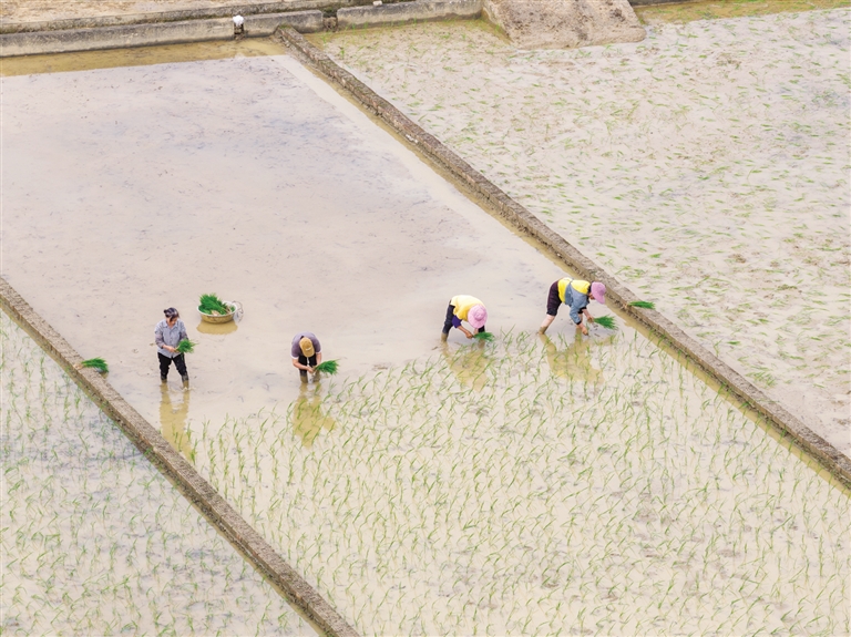 农户在田里插秧。