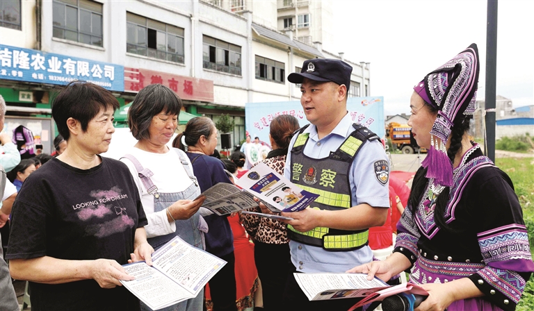 4月13日,在融安县长安镇融江社区,民警给群众讲解反诈、禁毒和国家安全等知识(见上图)。当日,县禁毒办、县公安局联合开展法治宣传教育活动,现场讲解反诈、禁毒和国家安全等知识,并发放宣传资料,进一步增强社区群众的反诈、禁毒和国家安全意识。