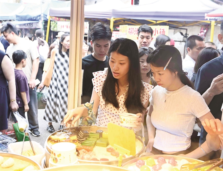 4月20日,青云民生市场内,在桂林读大学的李紫兰和朋友挑选美食。
