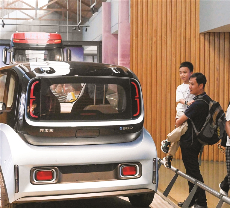 4月19日,在柳州工业博物馆,南宁游客黄思恒抱着孩子观看柳产新能源汽车的内部设计。