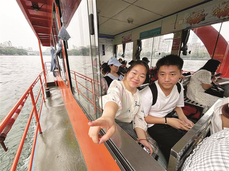 4月19日,水上公交上,在北海读大学的张丽珍与男友欣赏沿途美景。