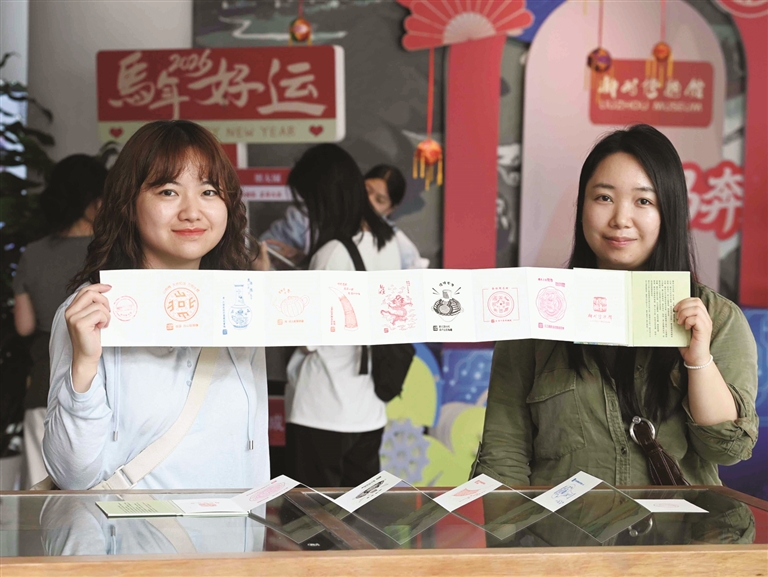 4月19日,柳州市博物馆内,贵州游客谢云(左一)和好友展示她们收集的柳州文物印章图案。