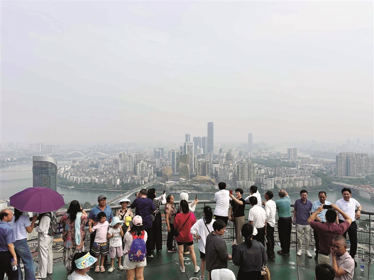 伴着歌声,登高远眺赏一城风景。4月19日,马鞍山山顶观景平台上,78岁的湖南游客王胜与好友合影留念。几十年前他曾在柳州工作,如今故地重游,感慨万千:“原来柳江上只有一座桥,现在跨江大桥多了,高楼也多了,城市变漂亮了!”