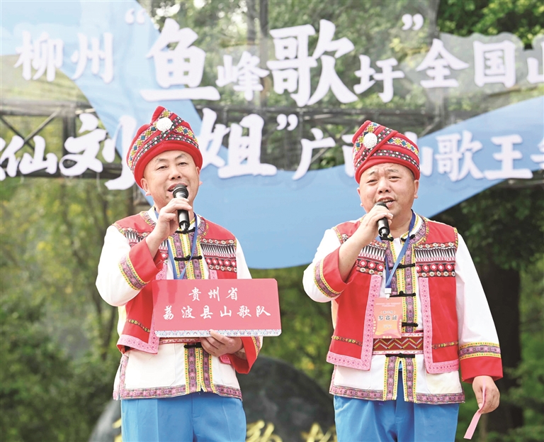 饱尝舌尖滋味后,再去聆听柳州的歌声。4月19日,鱼峰公园内,2026中国·柳州“鱼峰歌圩”全国山歌邀请赛暨“歌仙刘三姐”广西山歌王争霸赛系列活动吸引全国各地众多山歌爱好者组队参加。来自贵州荔波的陈明才与好友组队参赛。“第一次参赛,既兴奋又紧张。在柳州过广西三月三,山歌氛围浓,台下观众会跟着我们一起唱,我很开心。”