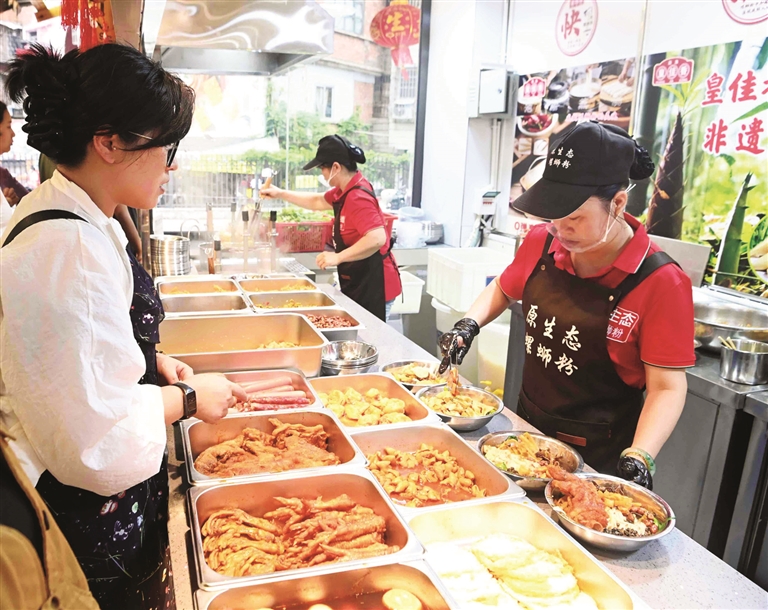 在桂林读大学的李紫兰和朋友挑选蒸糕、蒸饺等美食。一旁的柳州螺蛳粉店内,同样来自桂林的李女士正和家人品尝这份独特的柳州味道。“来柳州吃正宗的柳州螺蛳粉,我们要好好品尝下!”一份柳州美食,唤醒游客美好的一天。
