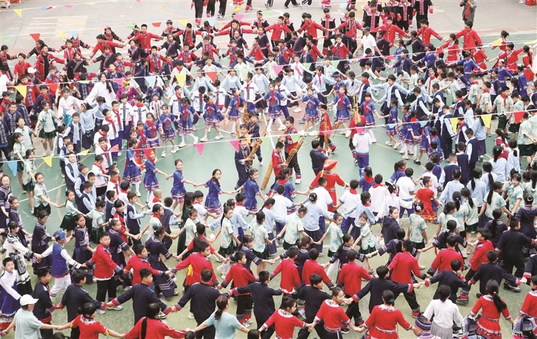 走出校门,浸润家庭与社区。一个孩子带动一个家庭,一个个家庭影响整个社会。跳竹竿舞,教会孩子协作;制作五色糯米饭,让孩子懂得分享;参加抢花炮,让孩子理解团结……铸牢中华民族共同体意识的种子,已在日常土壤中悄然生根。