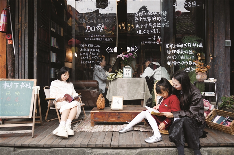 4月11日,四川省阆中市,游客在阆中古城内的树下书栈读书休闲。