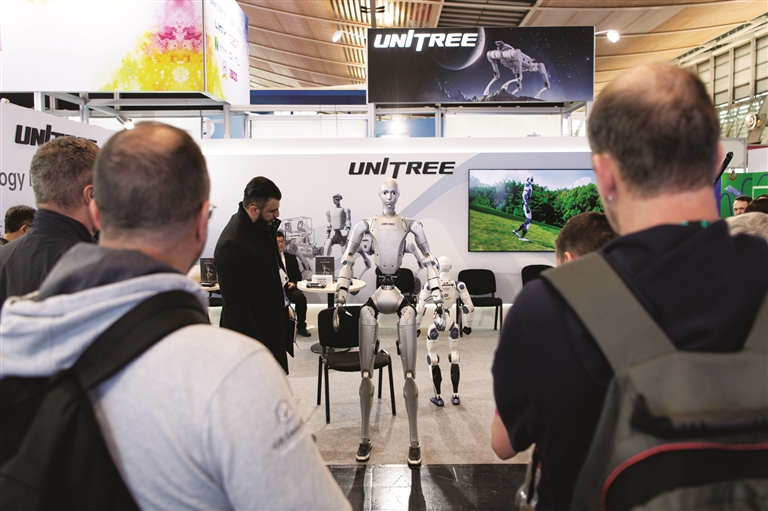 这是4月20日在德国汉诺威工业博览会拍摄的宇树科技展台。