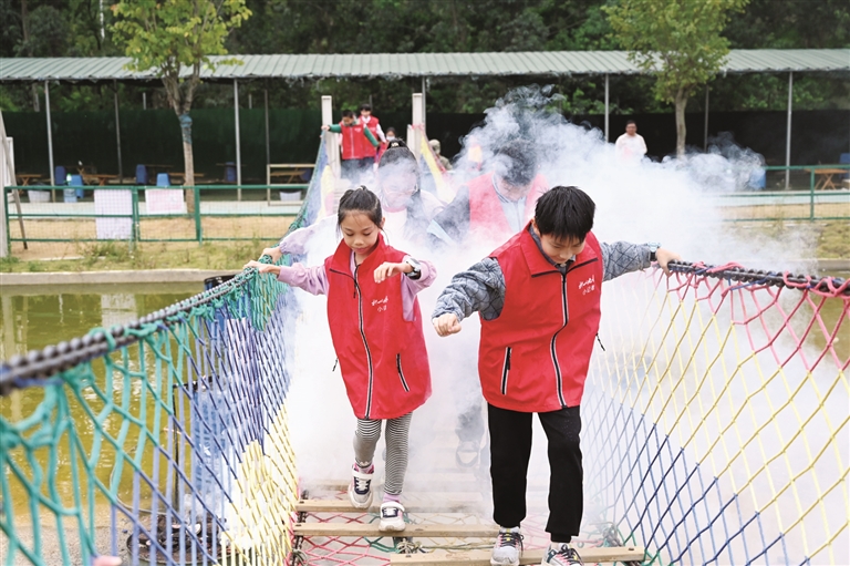 “飞夺泸定桥”体验环节将活动推向高潮。“小记者”们争先恐后地登上仿真“泸定桥”,在模拟的爆炸声、水浪、烟雾的特效干扰下,“小记者”们没有惊慌失措,而是团结协作,手挽手互相掩护,勇敢地通过了“泸定桥”。完成任务后,“小记者”们兴奋地欢呼,庆祝胜利。