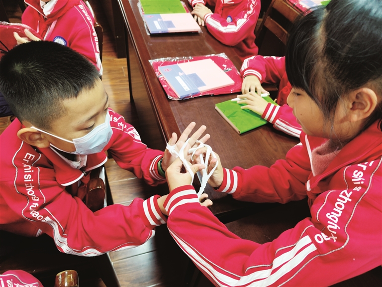 市二十四中附小学生在教室内玩翻花绳游戏。