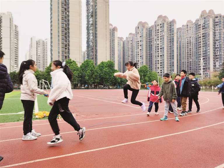 市德润小学学生在操场上跳长绳。