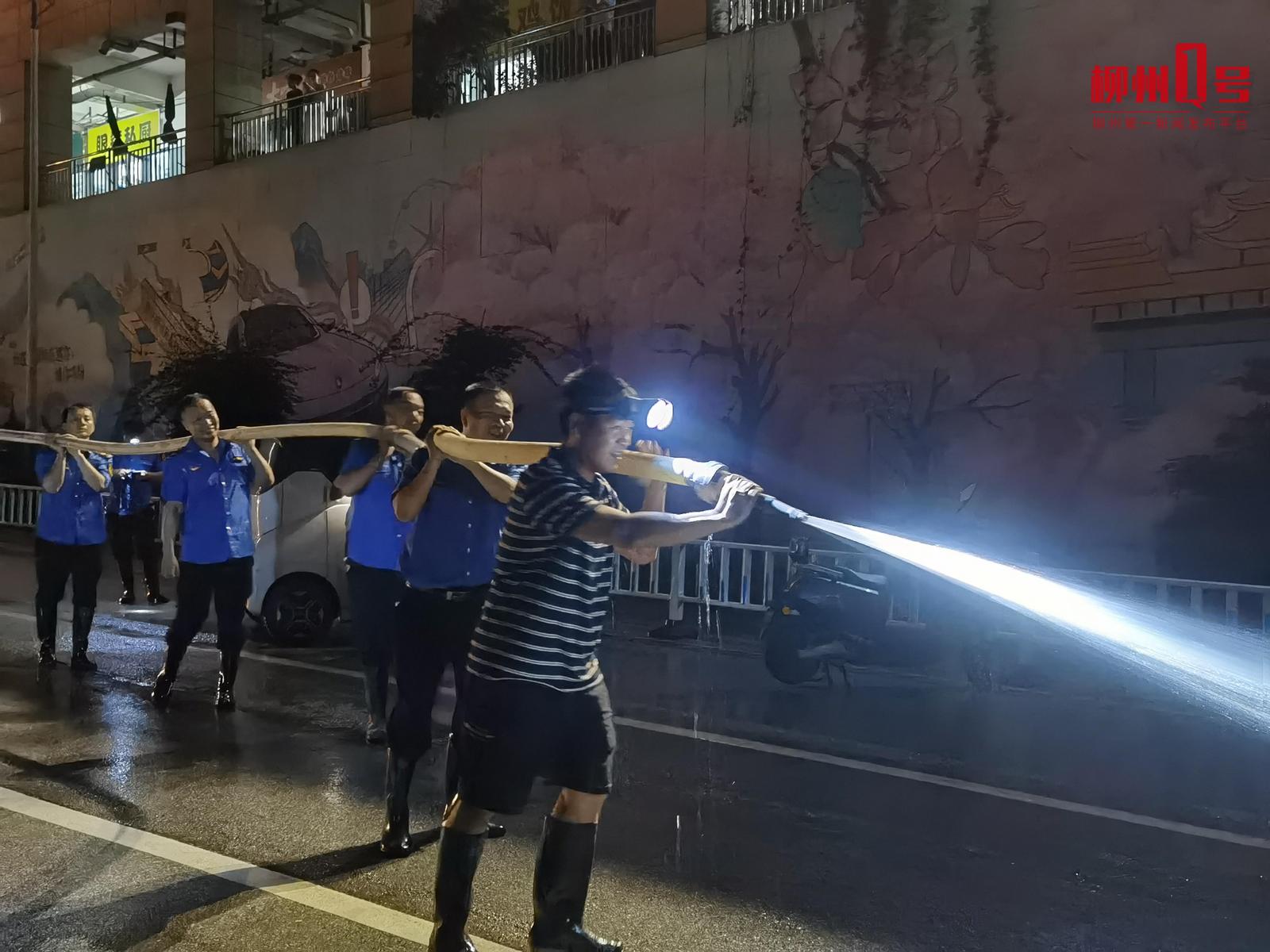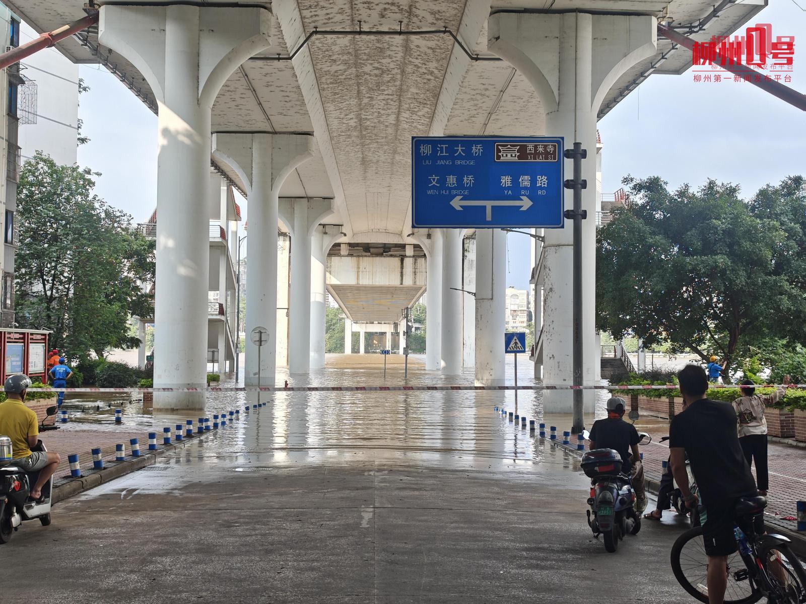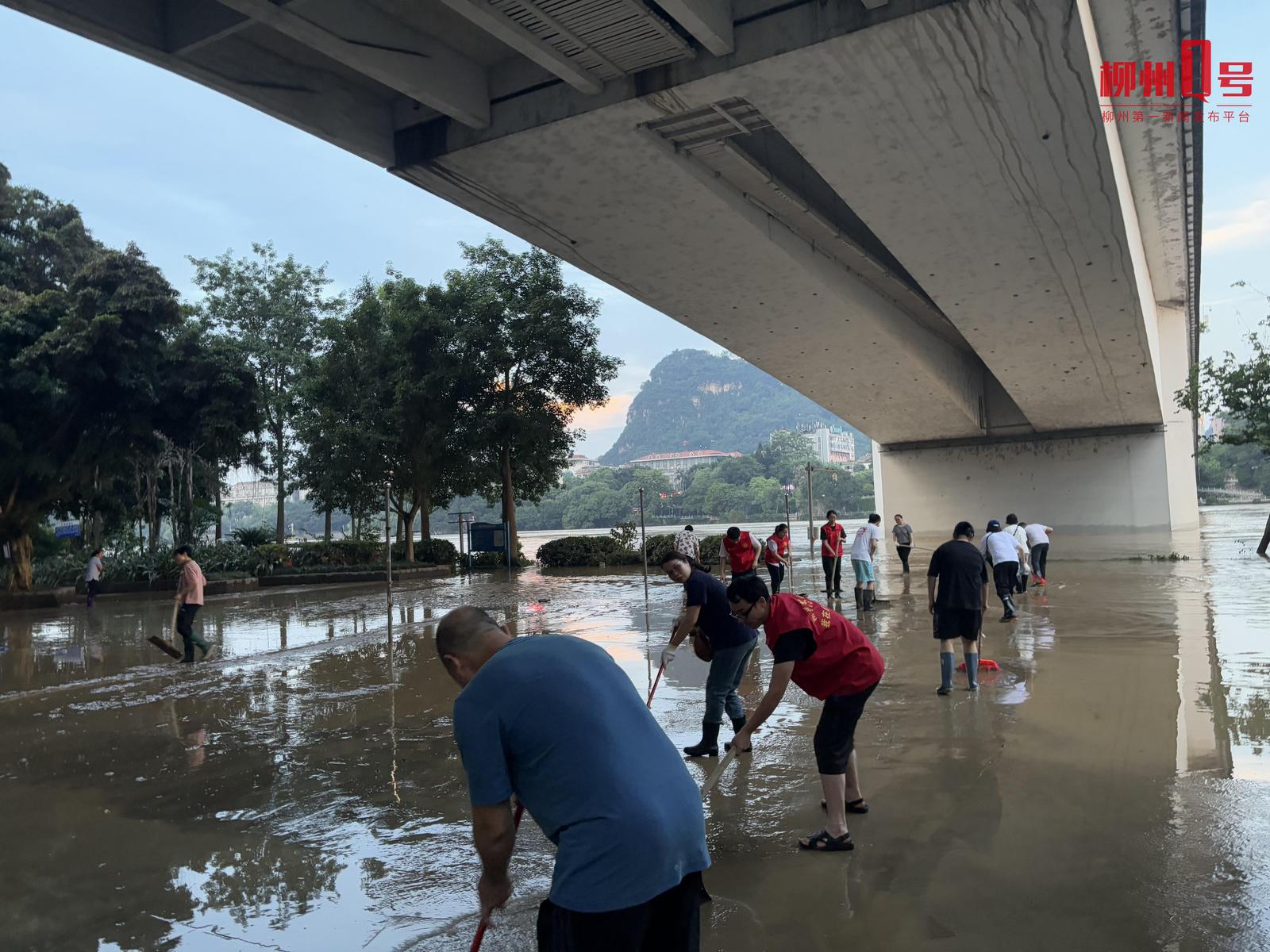 19点30分左右,柳江大桥桥底机动车道洪水已退去,消防队与城中街道五星社区工作人员及志愿者正在进行清淤与井盖检查。