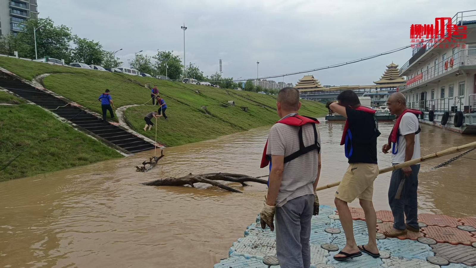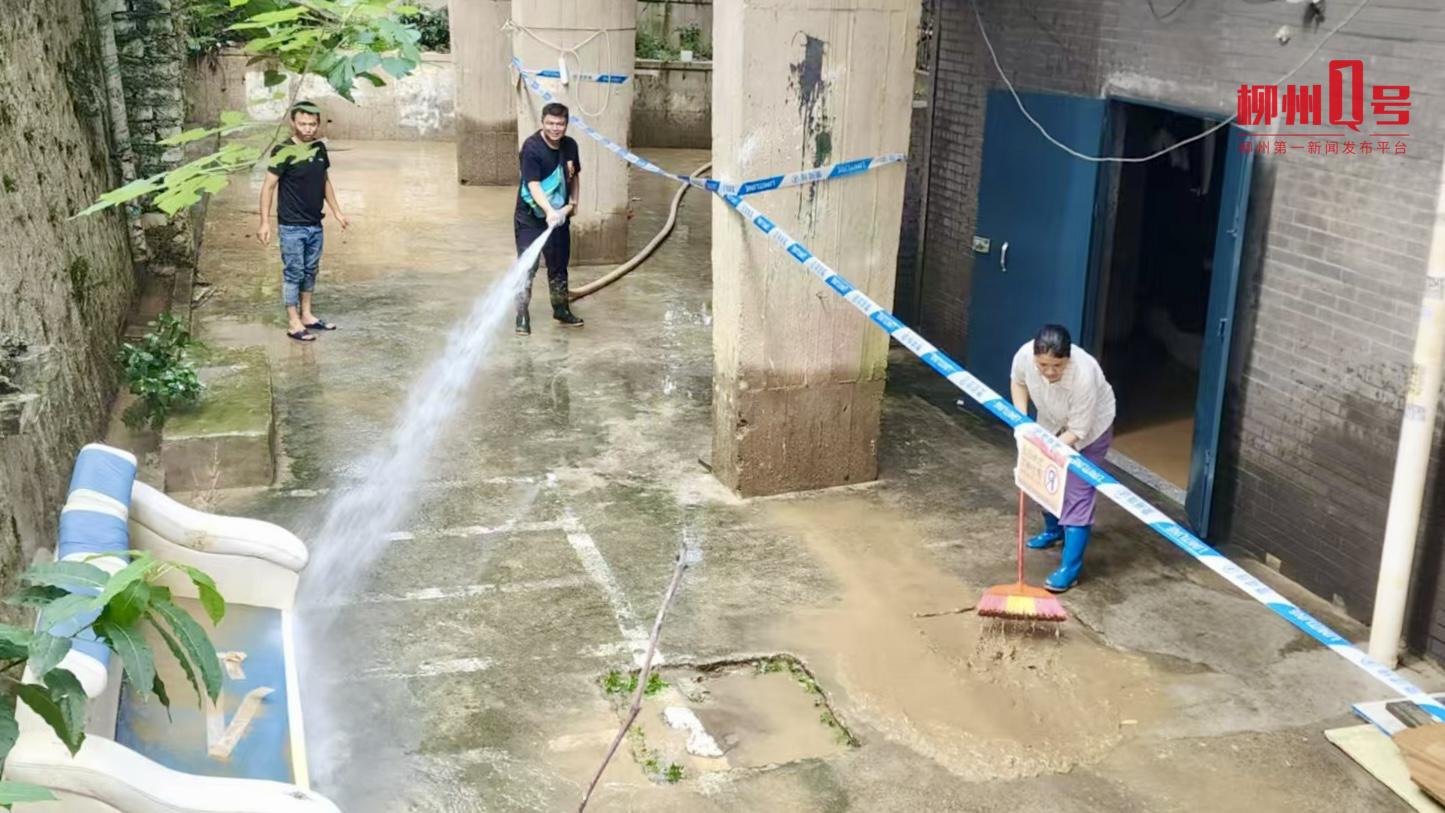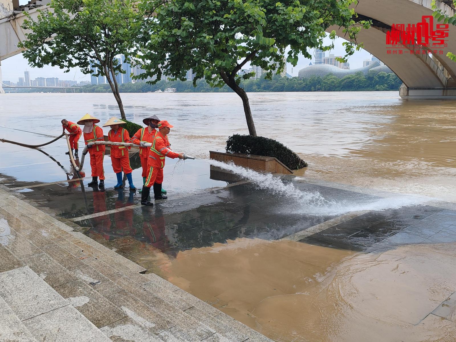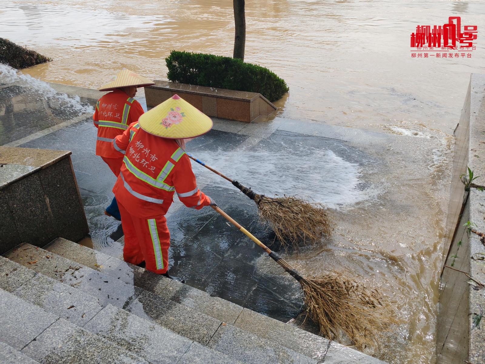 19点30分左右,柳江大桥桥底机动车道洪水已退去,消防队与城中街道五星社区工作人员及志愿者正在进行清淤与井盖检查。
